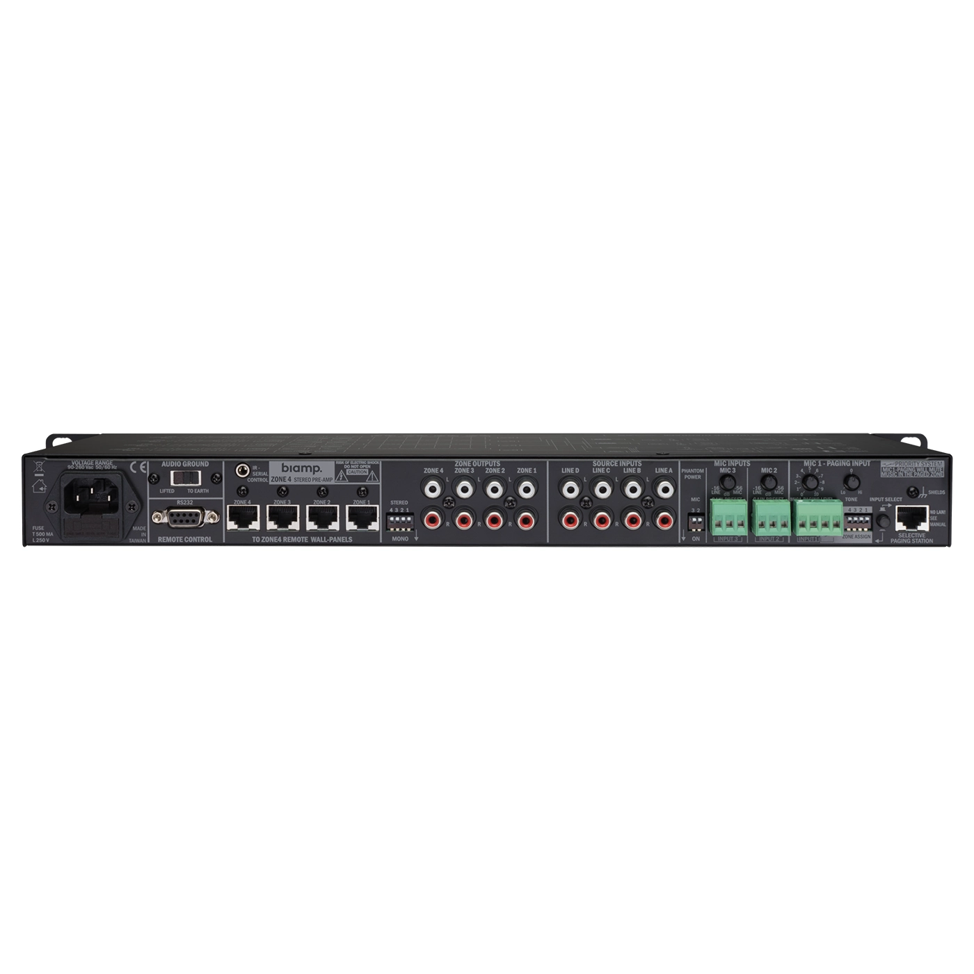 - 4 Stereo-Ausgangszonen Line-Quellenwahlschalter pro Ausgang Musik- und Mic-Mix-Pegelregler pro Ausgang Bass- & Höhenregler pro Ausgang Mono-Stereo-Schalter pro Ausgang