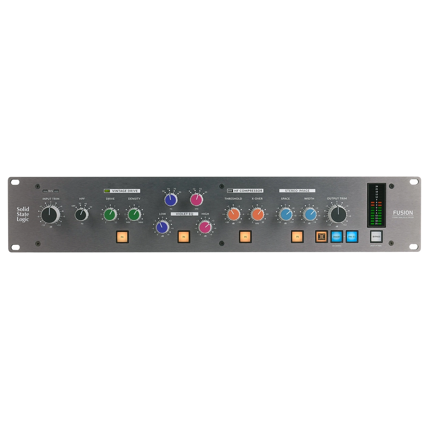 Analoger Stereo Bus Prozessor mit 6 separaten Schaltungen zur Signalbearbeitung (Vintage Drive, Violet EQ, HF Compressor, Stereo Image, Transformer, Listen Mic Compressor mit Dry/Wet-Option), schaltbarer HPF, schaltbarer Stero-Insert (XLR), 2x XLR In, 2x XLR Out, 19“/2 HE