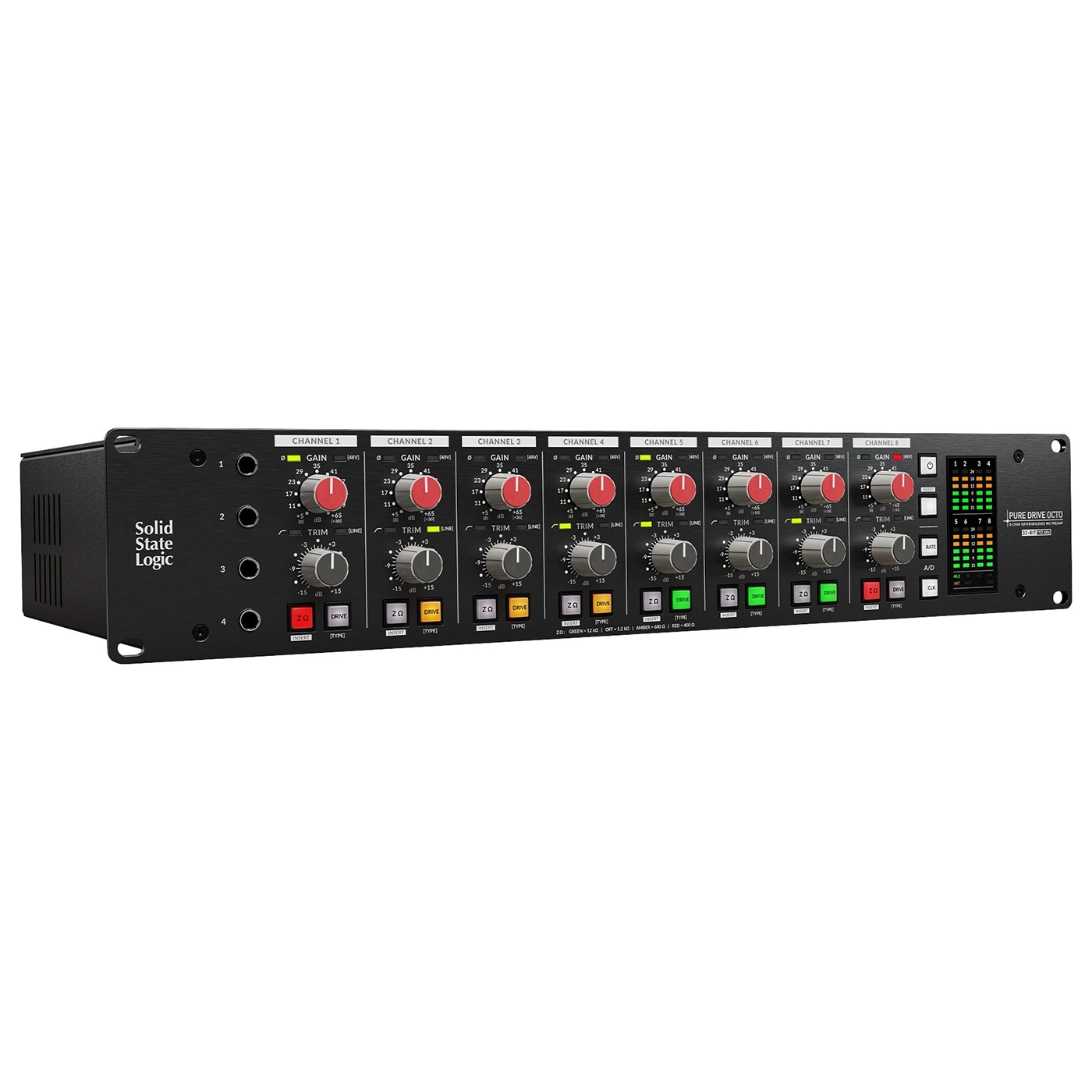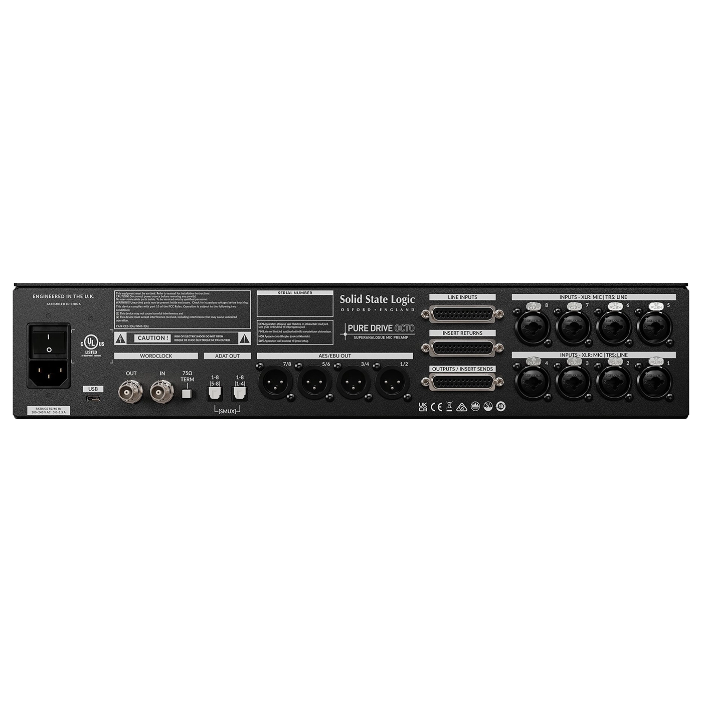 Analoger 8-fach Mikrofonvorverstärker, Gain, Trim, Insertweg, Phasenumkehrschalter, 48V Phantomspeisung, schaltbarer HPF, Impedanzwahlschalter, 3 Klangcharakteristiken (Clean, Drive 1, Drive 2), Klinke/XLR Combo Eingänge, D-Sub Anschlüsse, AES/EBU Ausgänge, zwei ADAT Ausgänge, USB-C Port, 19“/2 HE