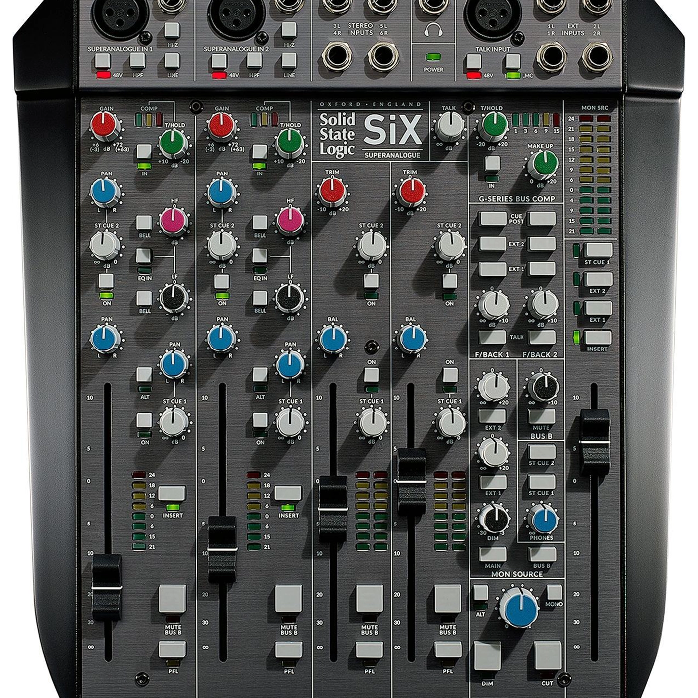 Mischpult, 6 Eingangskanäle, 2 SSL SuperAnalogue Preamps, 2-Band-EQ mit Bell/Shelve Schalter, 75 Hz HPF, SSL Listen Mic Compressor, symmetrische Signalführung, 100 mm Fader, SSL Master Bus Compressor, insgesamt 12 Inputs to Mix