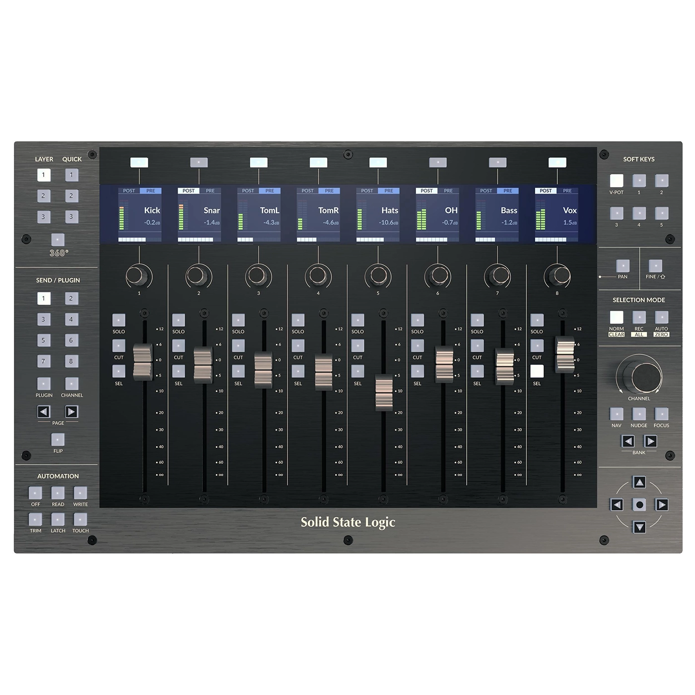 Kaskadierbarer DAW/Studio Controller für bis zu 3 DAWs gleichzeitig, 8 berührungsempfindliche 100 mm Fader und Encoder, 8 Hi-Res TFT LCD Farbdisplays, USB-C und High Speed USB 2.0 Ports, 2 Anschlüsse für Fußschalter, frei programmierbare Tasten/Schalter, kompatibel mit allen gängigen DAWs, justierbare Füße für verschiedene Oberflächenneigungen, optionale Rackwinkel erhältlich (19“/6 HE), inkl. Native Drumstrip & Native Vocal Strip 2 PlugIn Lizensen, Programmierung über kostenlose SSL 360° Software Application